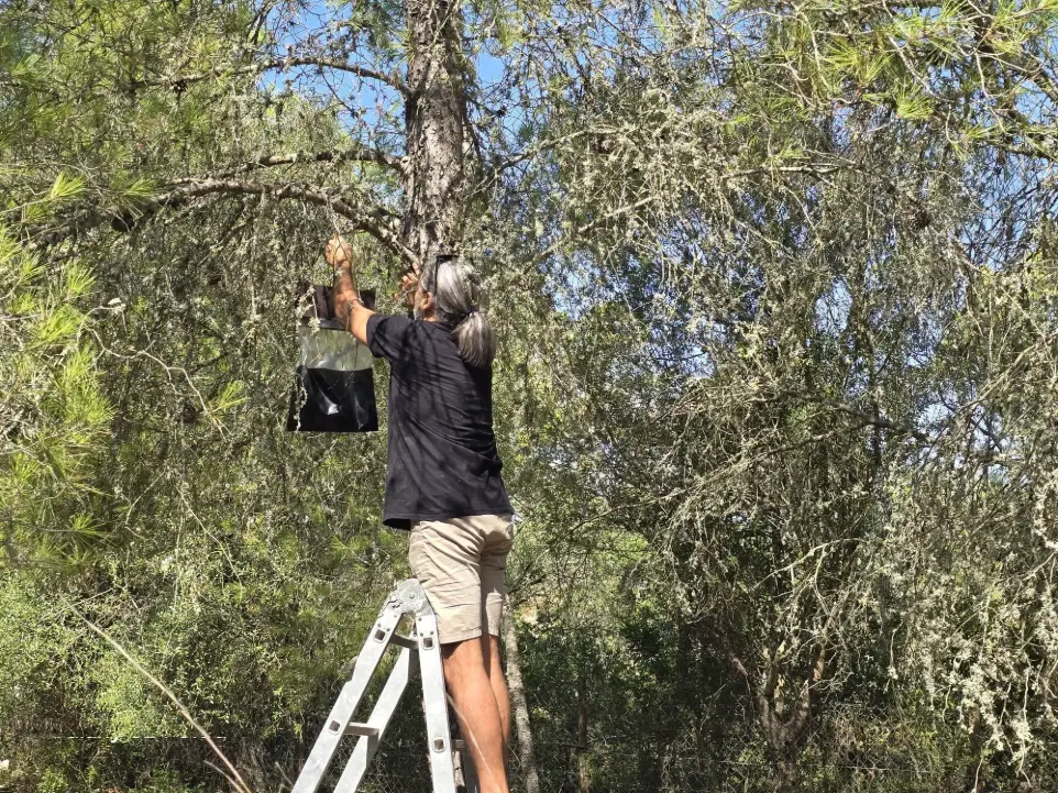 Si no te dio tiempo a aplicar endoterapia, las trampas de collar harán que cuando el gusano baje por el tronco caiga en la bolsa instalada. Reduce mucho la cantidad de gusanos por el suelo.